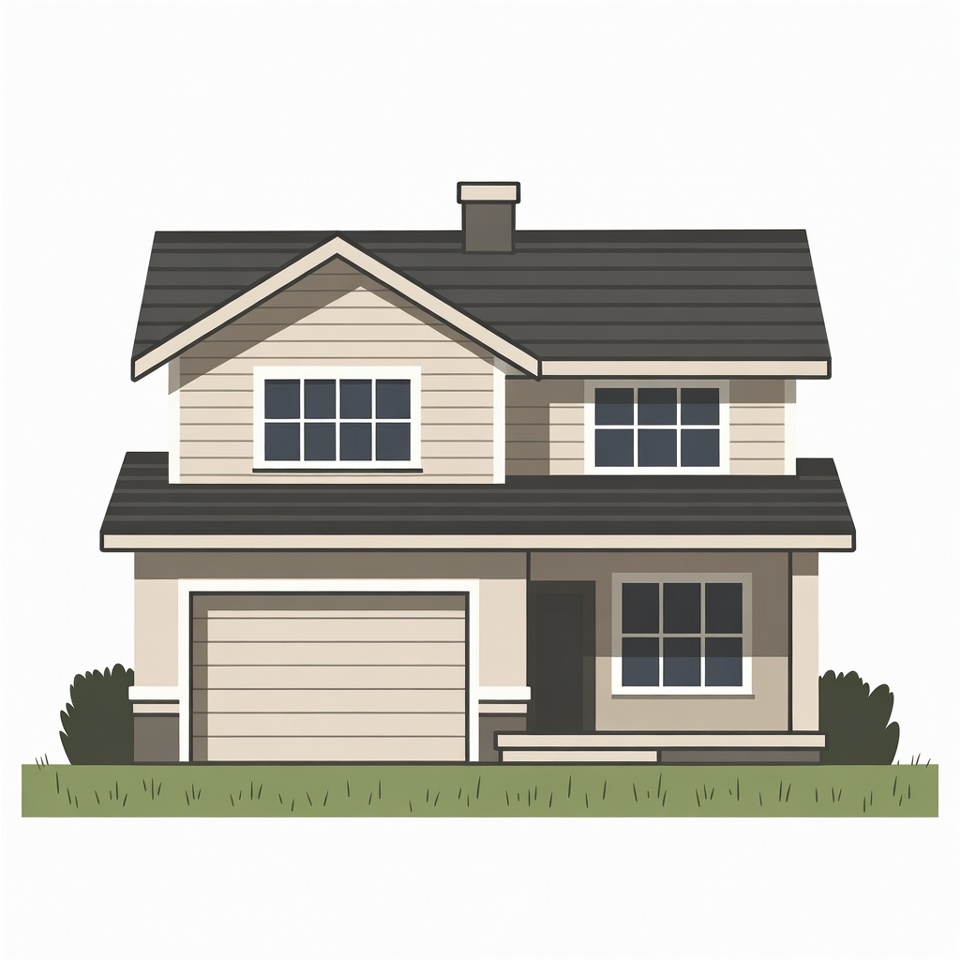 A clipart illustration of a beige two-story house with a dark gray roof and garage. It features multiple windows, a front door, and small bushes on a green lawn. The house is depicted on an isolated white background.