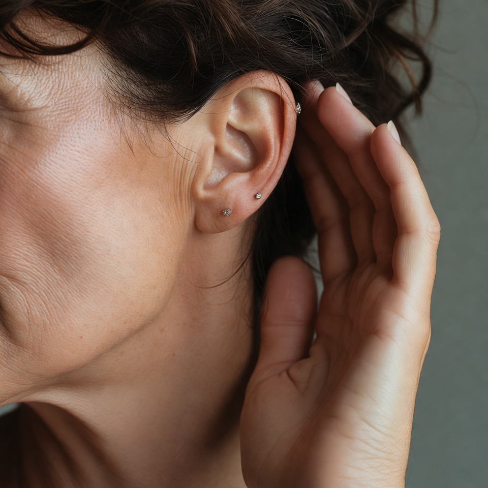 A woman with curly brown hair touches her ear with her hand. She wears small stud earrings and has a close-up view of her face and neck. Her skin shows fine lines, and her nails are neatly manicured.
