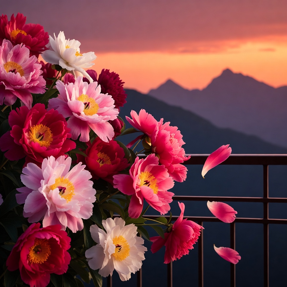 balcony, bloom, bouquet, falling petals, floral, flowers, mountains, nature, orange sky, petals, pink peonies, purple sky, railing, red peonies, sky, snow-capped mountains, sunset, vibrant flowers, white peonies, peonies