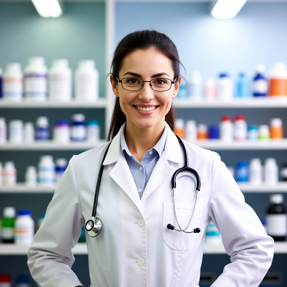 A smiling woman with dark hair in a ponytail wears glasses and a white lab coat with a stethoscope around her neck. She stands confidently with arms crossed in front of white shelves stocked with colorful medicine bottles in a pharmacy or medical setting. Bright fluorescent lights illuminate the modern interior.