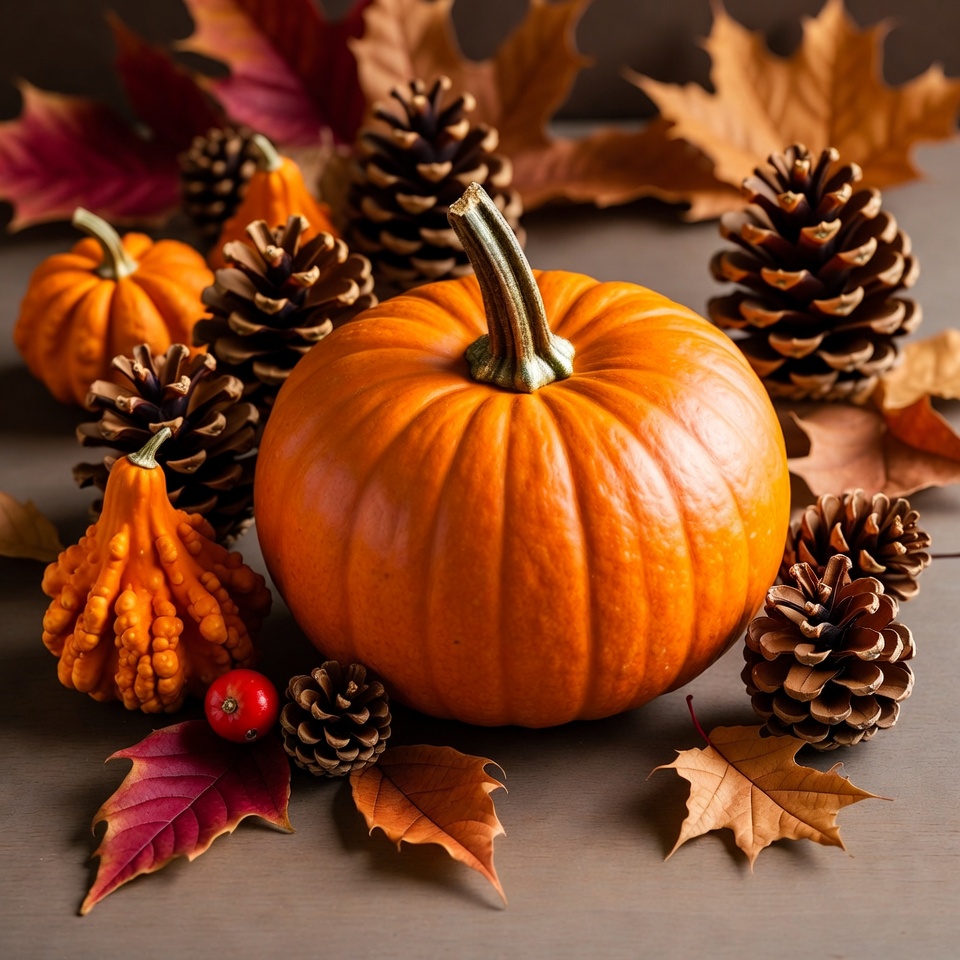 Pumpkin with Pinecones and Autumn Leaves