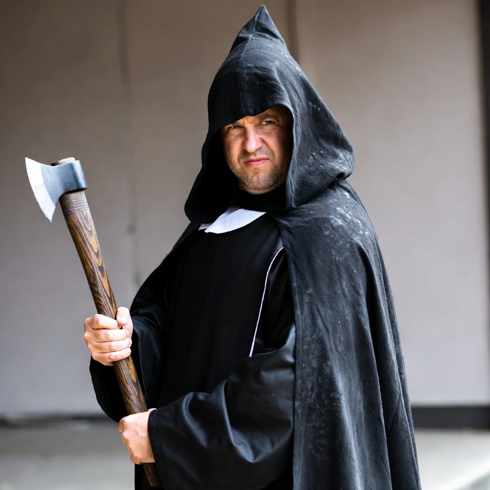 Man in black hooded robe holding axe