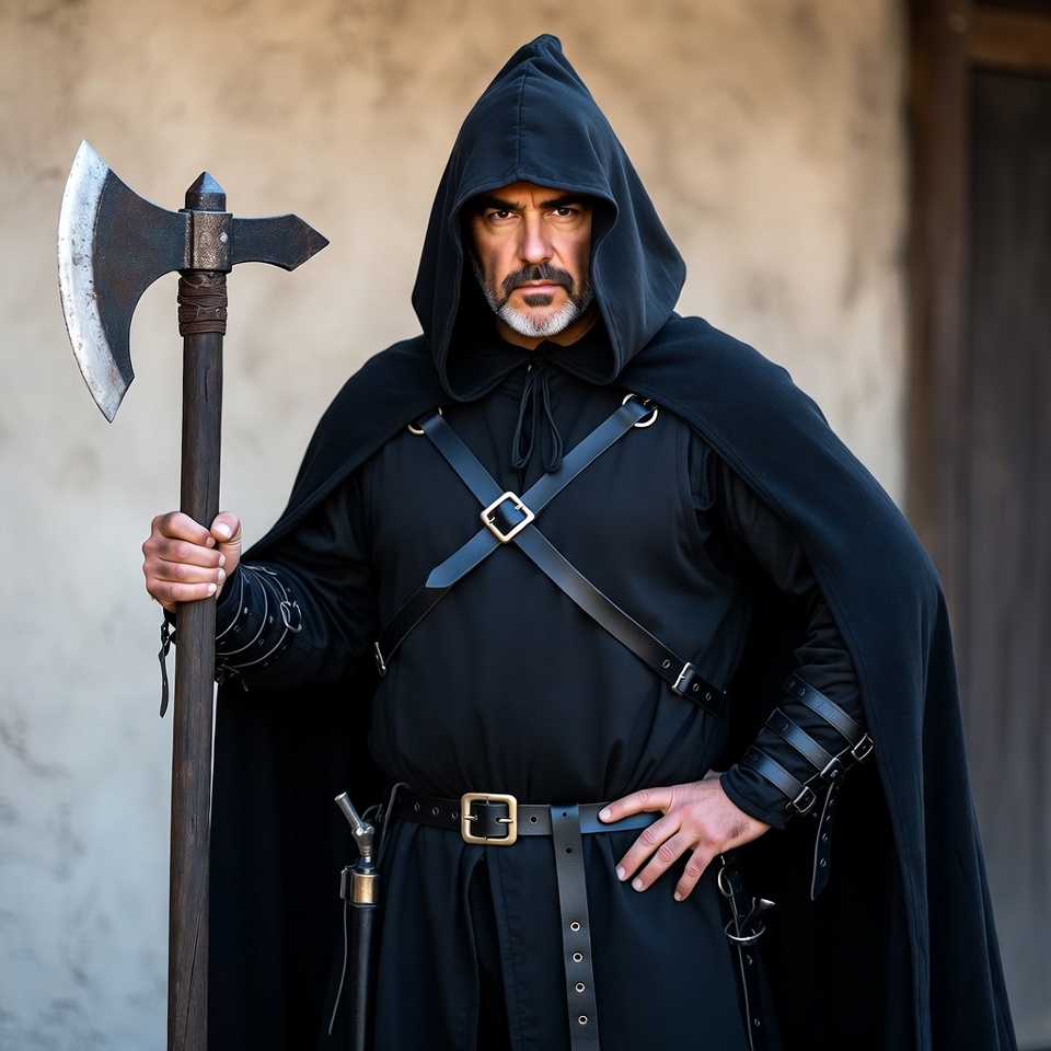 A man with a dark hooded cloak and goatee stands holding a large battle axe. He wears black leather straps across his chest, arm bracers, and a belt with a dagger. The scene is set against a textured beige wall.