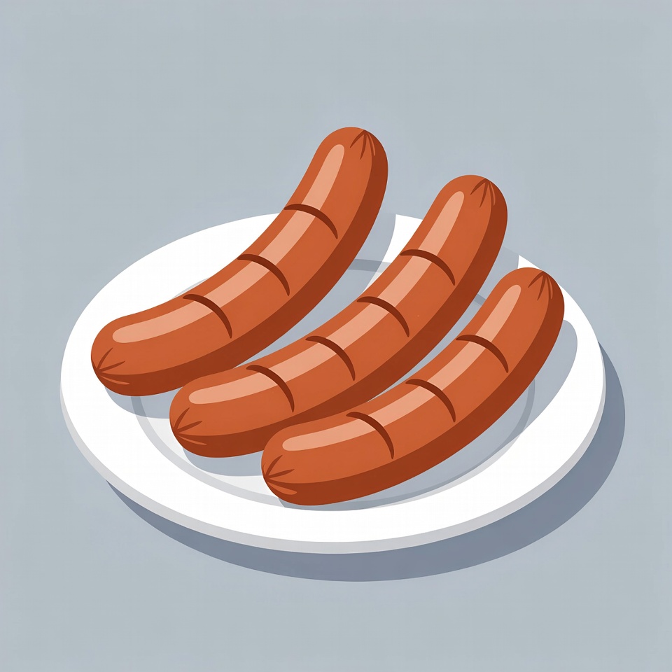 A simple illustration shows three grilled sausages with visible grill marks arranged on a white plate. The sausages are reddish-brown and curved slightly. The image features a plain gray background.