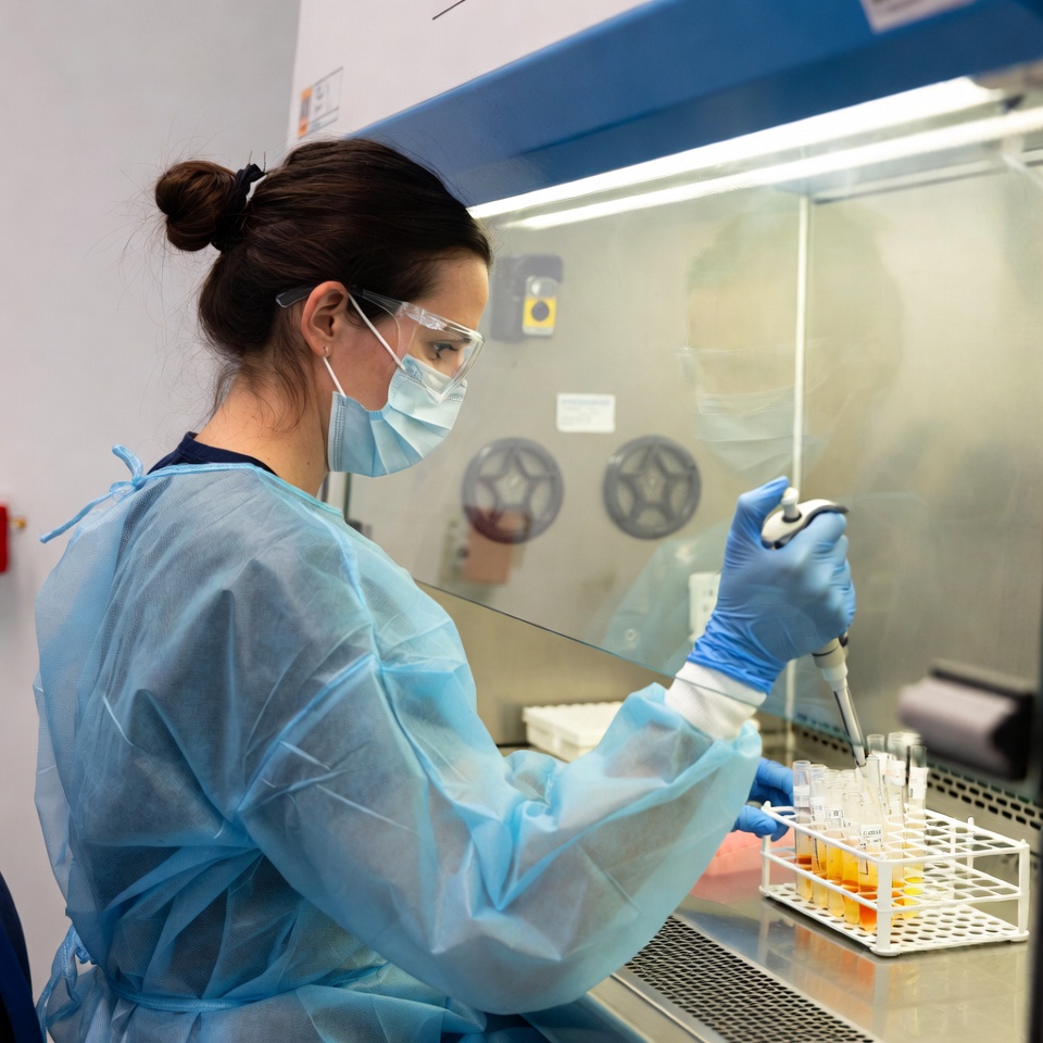 A woman with brown hair in a bun wears blue protective suit, mask, goggles, and gloves while pipetting yellow liquid into wells inside a biosafety cabinet. She stands focused at the lab bench with test tubes and equipment visible. The laboratory setting features safety lights and controlled environment.