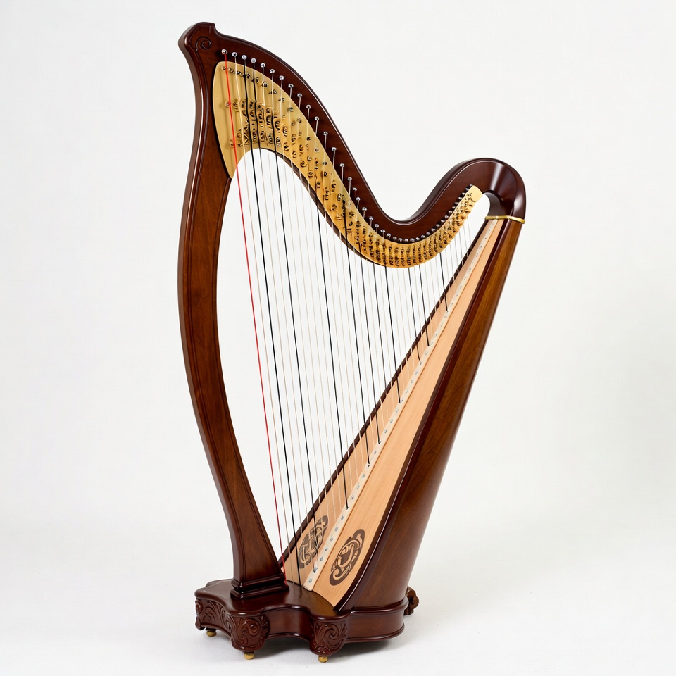 A beautifully crafted wooden harp stands on a plain background. It features a rich brown frame, gold soundboard, and numerous taut strings in red, white, and other colors. The harp has ornate carvings on its base and pillar.