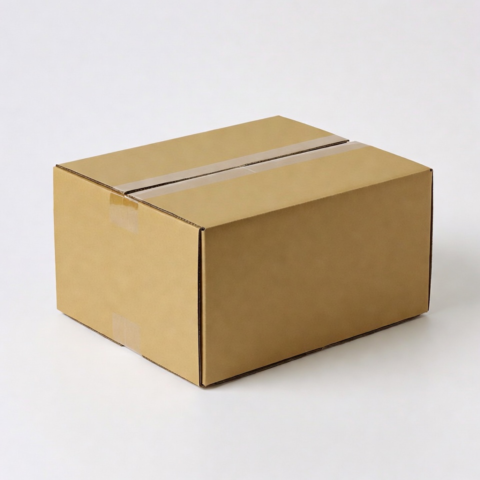 A brown cardboard box sealed with clear tape sits on a plain white background. The box is viewed from an angle, showing its folded edges and taped seams. It appears empty and isolated for display.