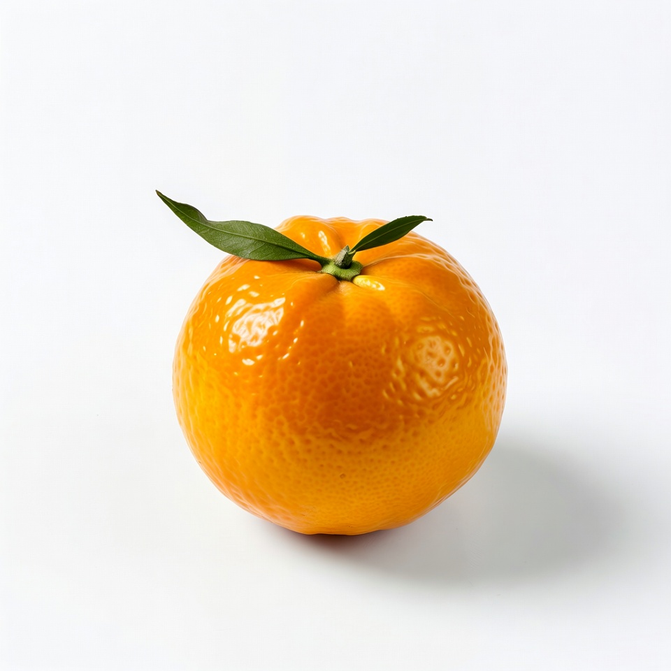 A vibrant mandarin orange with textured orange peel sits on a white background. A fresh green leaf and stem protrude from the top of the fruit. The orange has a glossy, realistic appearance.