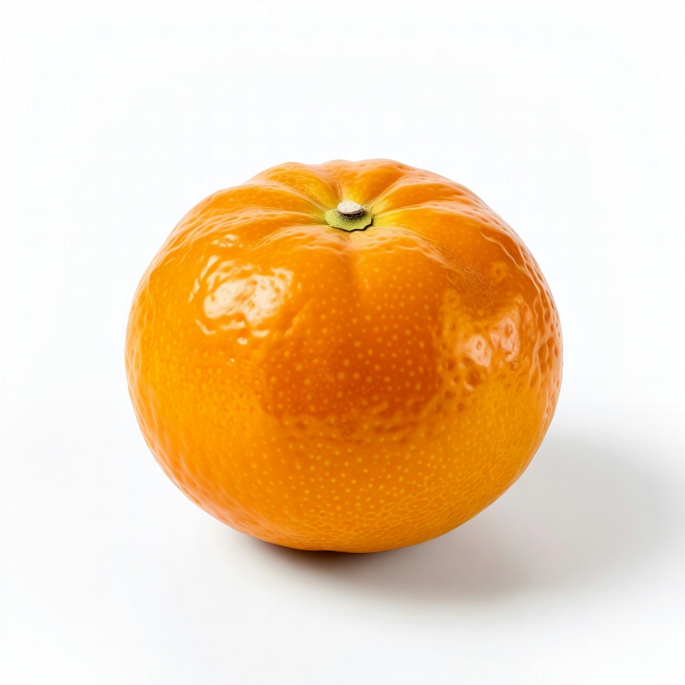 citrus fruit, fresh fruit, fruit closeup, glossy peel, green stem, isolated background, orange fruit, ripe orange, single fruit, tangerine, white background, mandarin orange