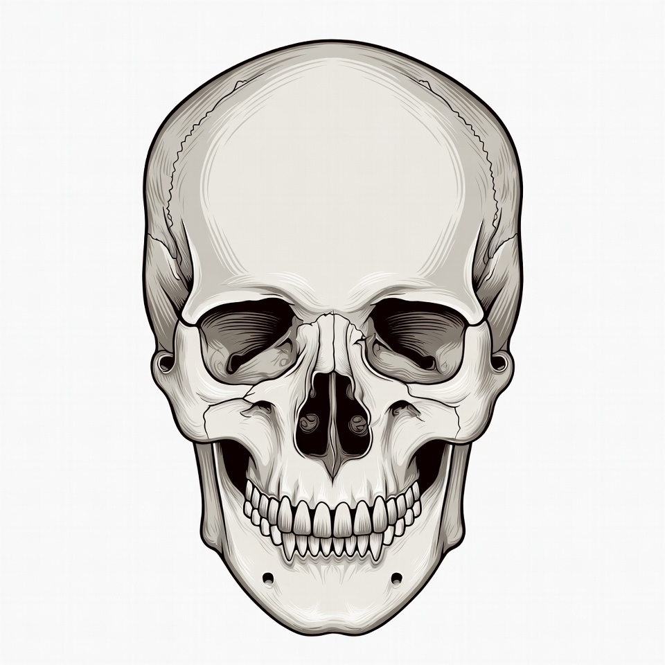 anatomy, bone, clipart, cranium, eye sockets, grayscale, head, human skull, illustration, isolated background, jaw, line art, skeleton, teeth, skull