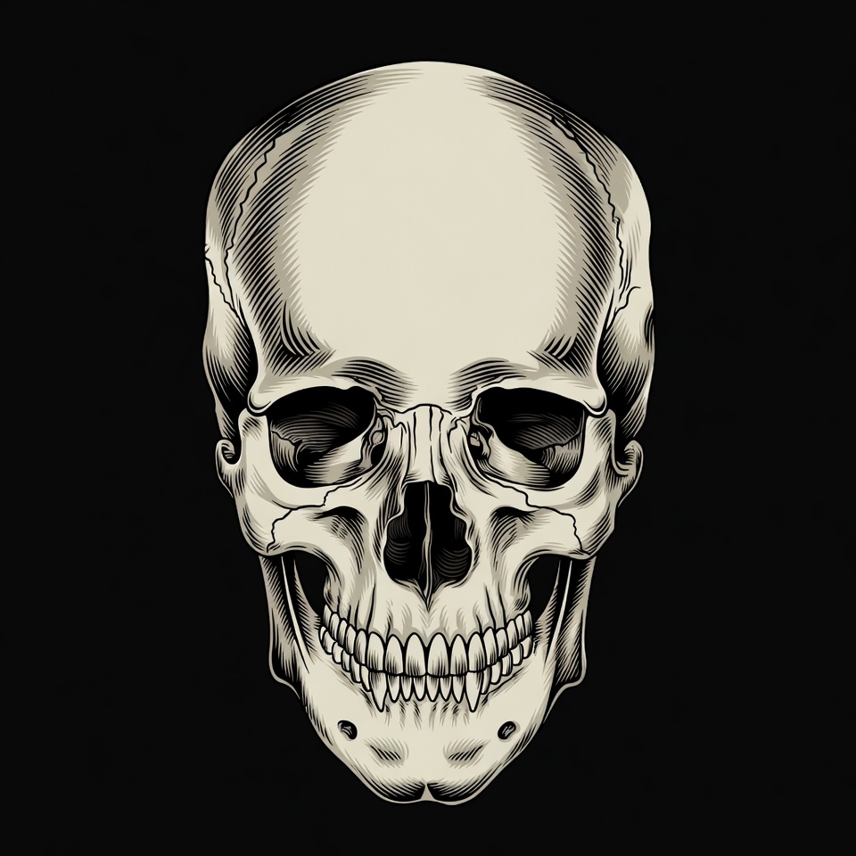 anatomy, black background, bones, death symbol, eye sockets, grinning skull, human skull, ink drawing, isolated background, line art, skeleton, skull illustration, teeth, white skull, skull