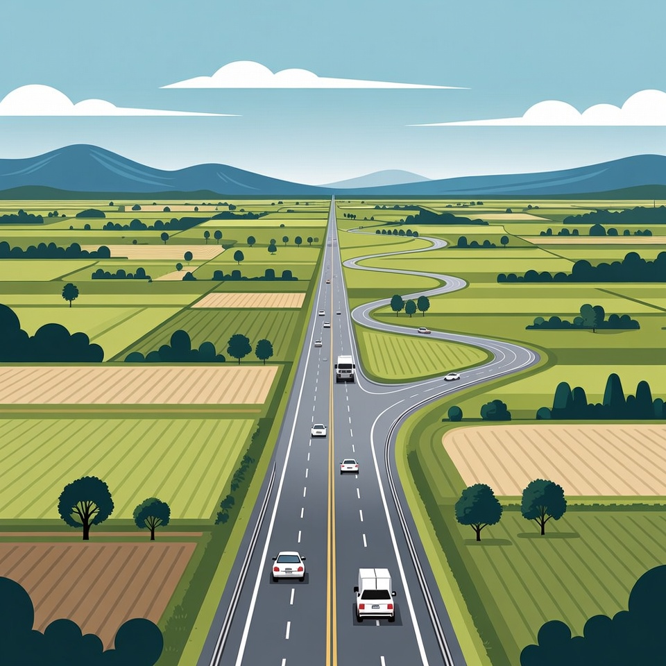 A flat illustration depicts a long, curving white road winding through vast green fields and farmlands under a blue sky with white clouds. Several white cars drive along the road, flanked by trees and rolling hills in the distance. The scene features vibrant green crops, brown soil patches, and distant mountains.