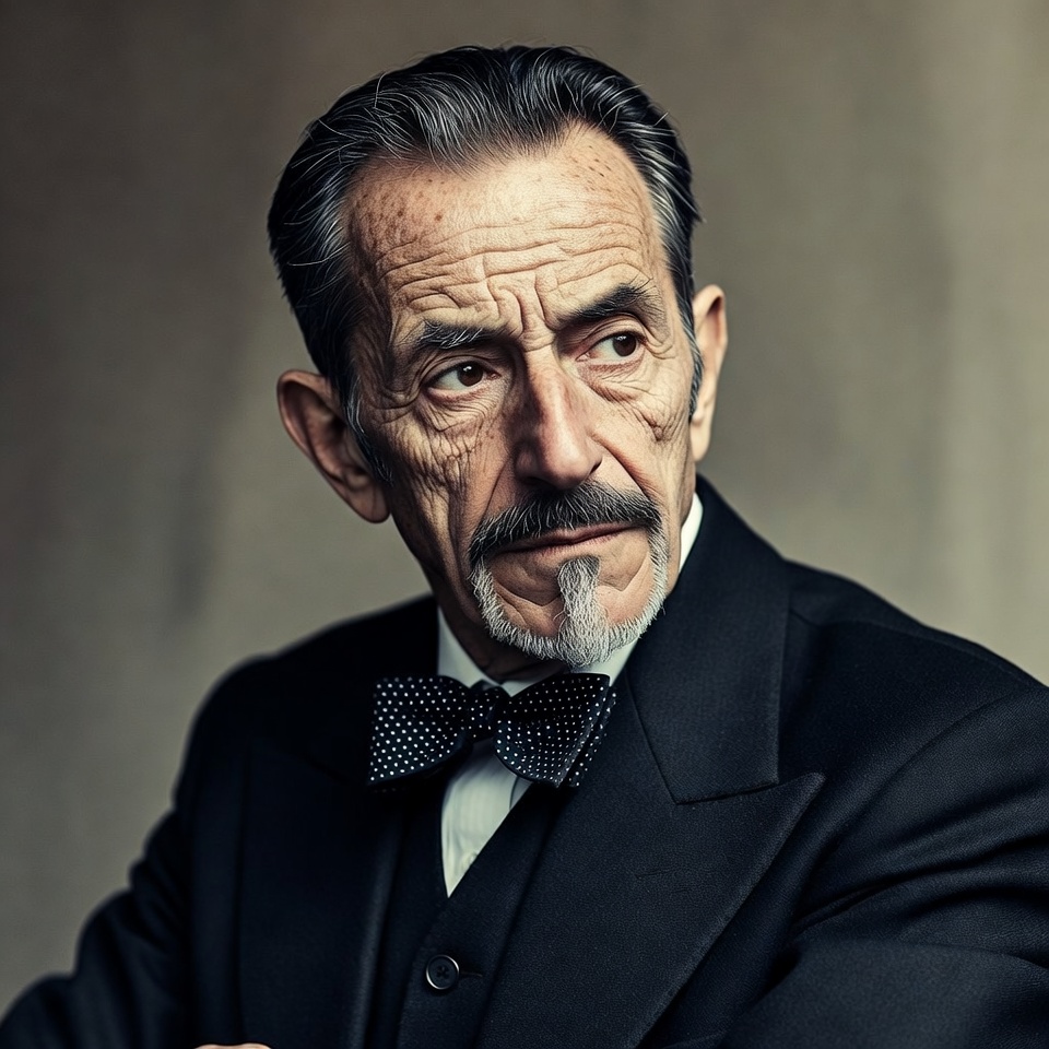 An elderly man with gray hair, wrinkled face, and a mustache stares sideways with a subtle frown. He wears a black tuxedo jacket, white shirt, and polka-dot bow tie. He stands against a plain beige background with arms crossed.