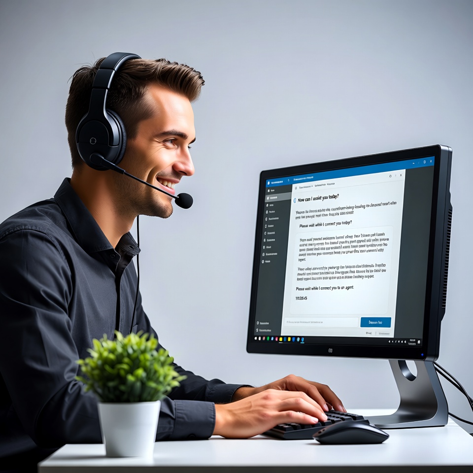 A young man with short dark hair wears a black over-ear headset with microphone and sits at a desk facing a large computer monitor. He smiles while typing on a keyboard, with a small green potted plant nearby. The screen displays a customer support chat interface in a professional office setting.
