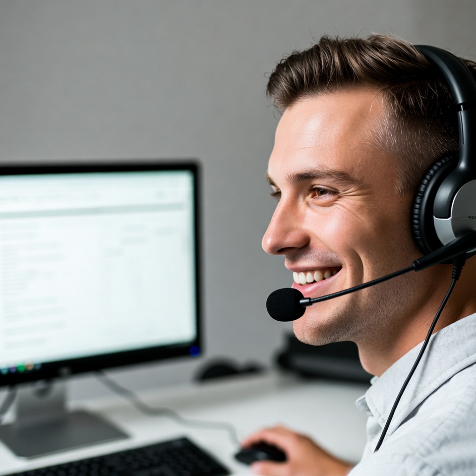 A young White man with short brown hair wears a black headset with microphone while sitting at a desk. He smiles happily at the camera, facing sideways, with a computer monitor displaying a blank screen in front of him. He is dressed in a light blue collared shirt and operates a keyboard and mouse.