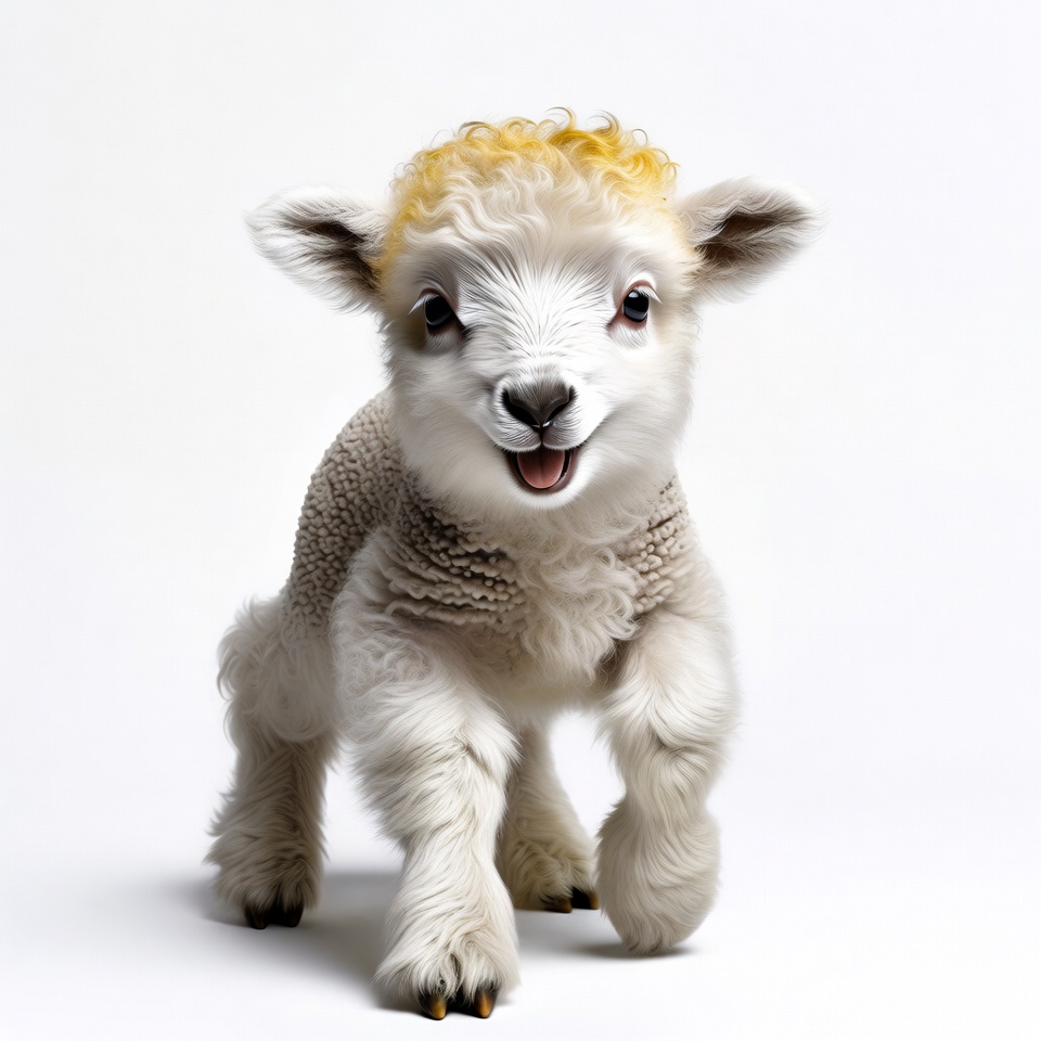 adorable lamb, animal, baby lamb, big eyes, blonde wig, curly wig, cute lamb, farm animal, fluffy lamb, happy lamb, isolated background, lamb face, playful lamb, sheep, smiling lamb, white background, white lamb, woolly lamb, lamb