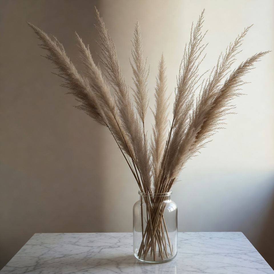 A bouquet of tall, fluffy pampas grass in neutral beige tones stands in a clear glass jar. The jar sits on a white marble table with soft natural light illuminating the scene. The grass plumes fan out elegantly against a light beige background.