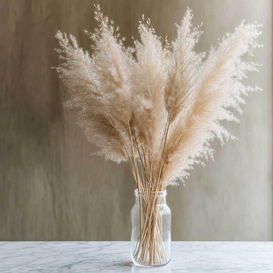 A bouquet of tall, fluffy beige pampas grass stems stands in a clear glass jar on a white marble table. The soft, feathery plumes fan out gently against a neutral beige wall. The arrangement features natural dried grass with delicate textures.