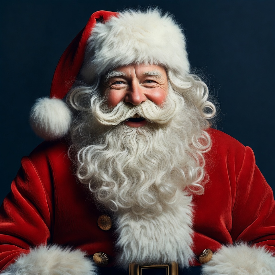 Christmas, Santa hat, White, black belt, bushy eyebrows, curly hair, dark background, festive, holiday, joyful expression, man, portrait, red suit, smiling Santa, white beard, white fur, Santa Claus