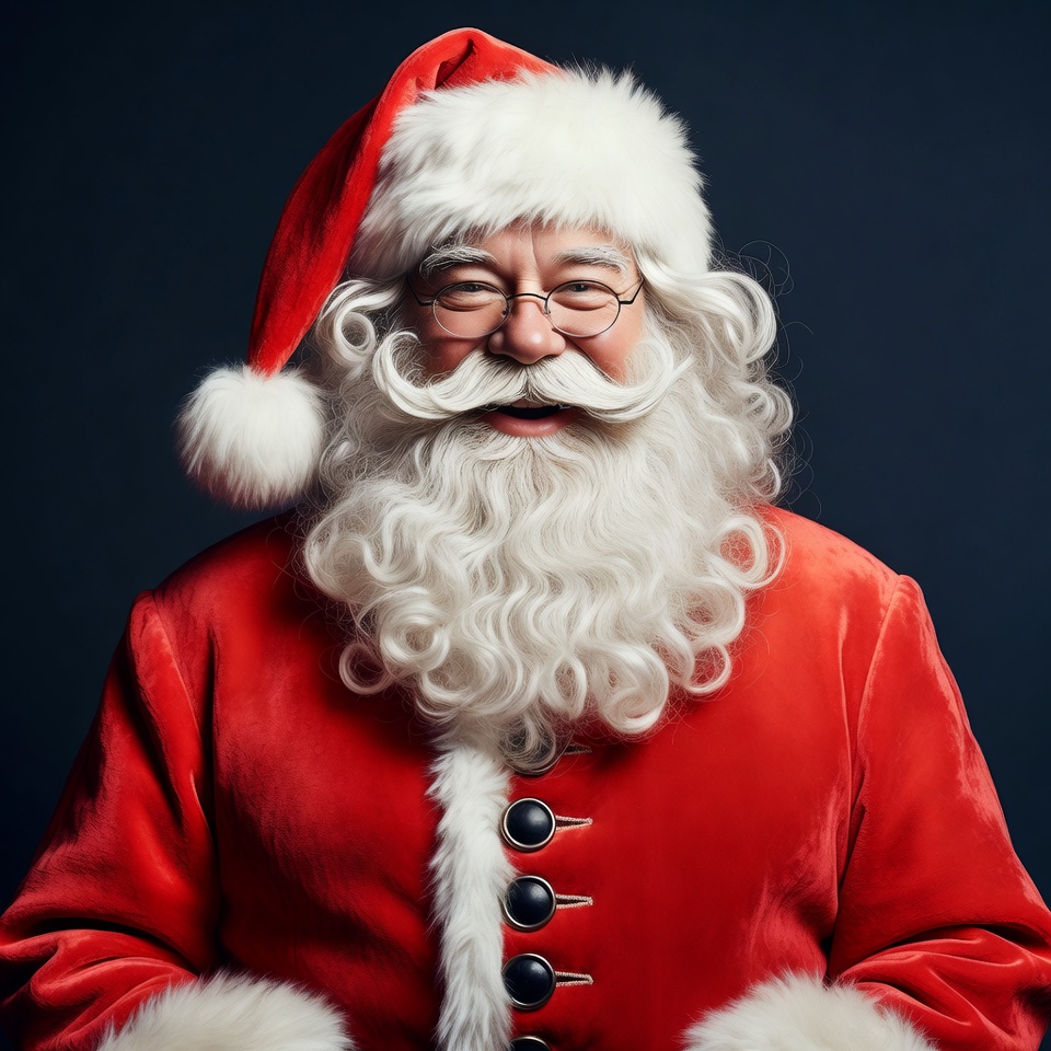 A cheerful Santa Claus with a long white beard and curly white hair wears a classic red velvet suit with black buttons and white fur trim. He dons a matching red hat with a white pom-pom and round wire-rimmed glasses. He smiles warmly against a dark background.