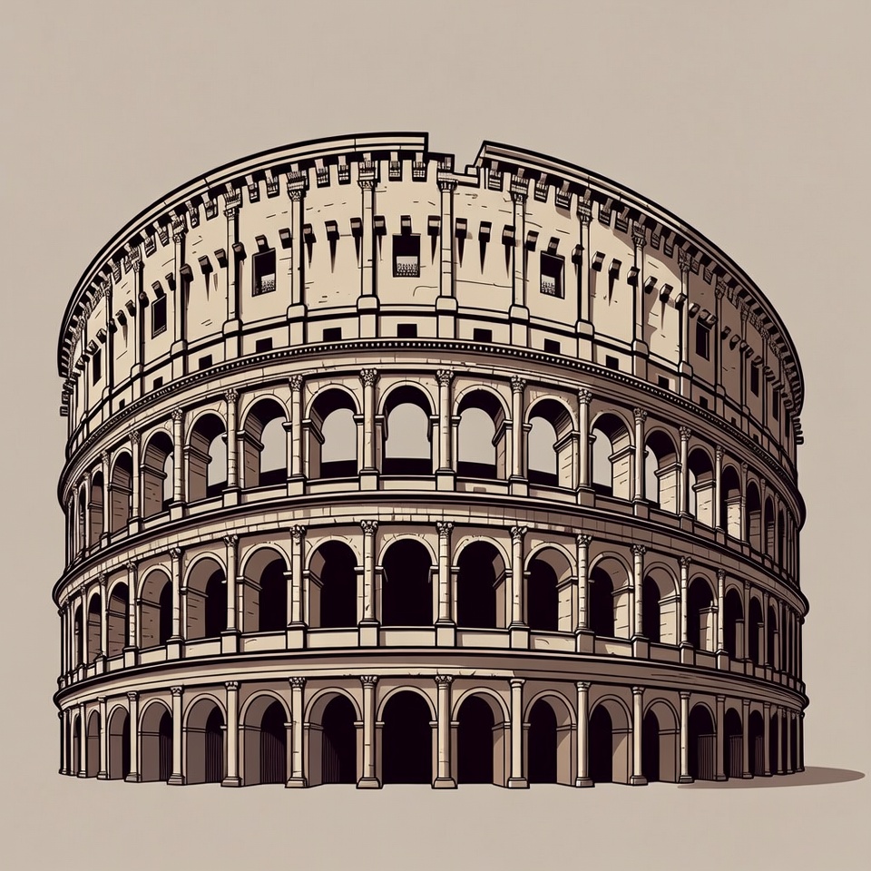 Roman Colosseum, Roman architecture, amphitheater, ancient Rome, antiquity, arches, architecture, circular structure, clipart, columns, historical building, illustration, ink sketch, isolated background, landmark, line art, monument, ruins, vector art, vintage drawing, Colosseum