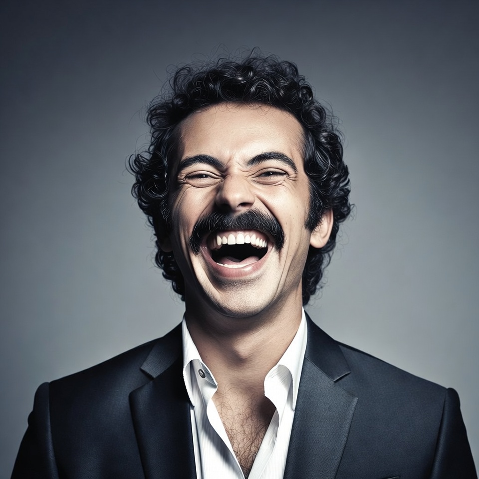 A man with curly dark hair and a mustache laughs heartily while wearing a dark suit and white shirt. His eyes are squinted in amusement, and he faces the camera directly on a plain gray background. The portrait highlights his joyful expression and formal attire.