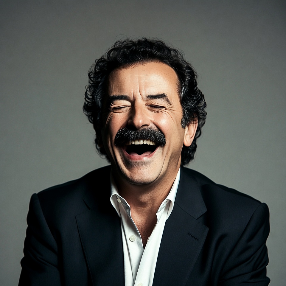 A Middle Eastern man with curly black hair and a thick mustache laughs heartily. He wears a black suit jacket over a white dress shirt. The portrait is set against a plain gray background.