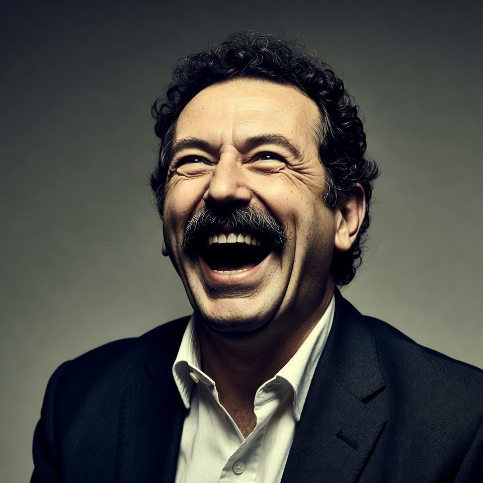 A middle-aged man with curly dark hair and a thick mustache laughs heartily against a gray background. He wears a dark suit jacket over a white dress shirt. His eyes are squinted in amusement with wide-open mouth.