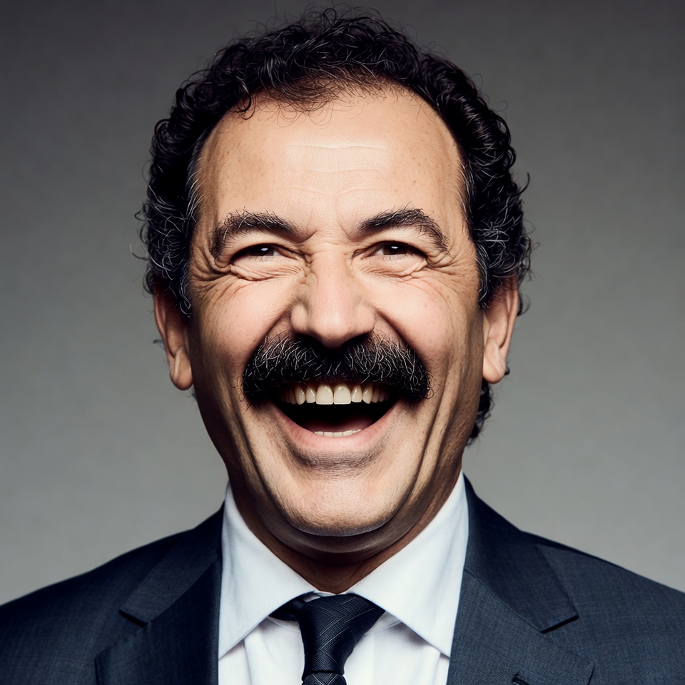 A middle-aged man with curly dark hair and a thick mustache smiles widely, revealing his teeth, against a gray background. He wears a dark suit, white dress shirt, and black tie. His expression is joyful and engaging.