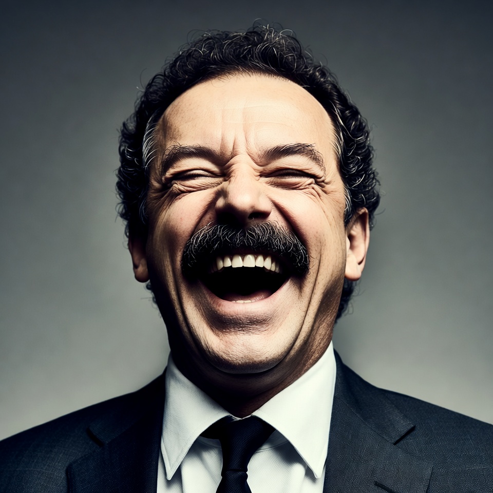 A middle-aged man with curly dark hair and a thick mustache laughs heartily with his eyes squinted and mouth wide open. He wears a dark suit, white dress shirt, and black tie. The portrait is set against a plain gray background.