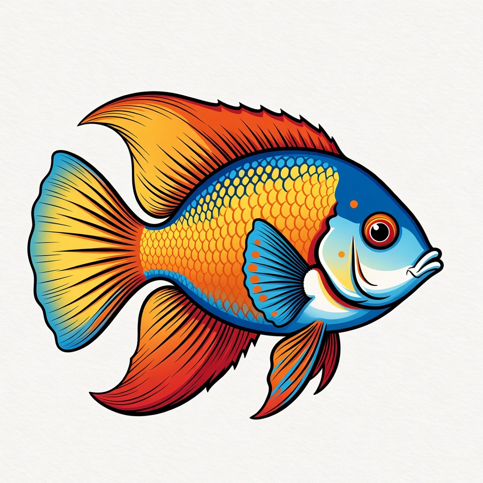 aquarium fish, blue fish, cartoon fish, clipart, colorful fish, fish illustration, freshwater fish, isolated background, orange spots, red fins, sea creature, tropical fish, vector art, vibrant colors, yellow fins, rainbowfish