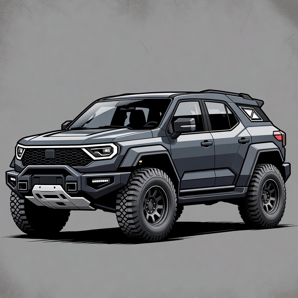 A detailed digital illustration of a rugged gray SUV with off-road features on a gray background. The vehicle has large black wheels, flared fenders, a front bull bar, LED lights, and a roof rack. It features a bold grille, tinted windows, and muscular body lines.