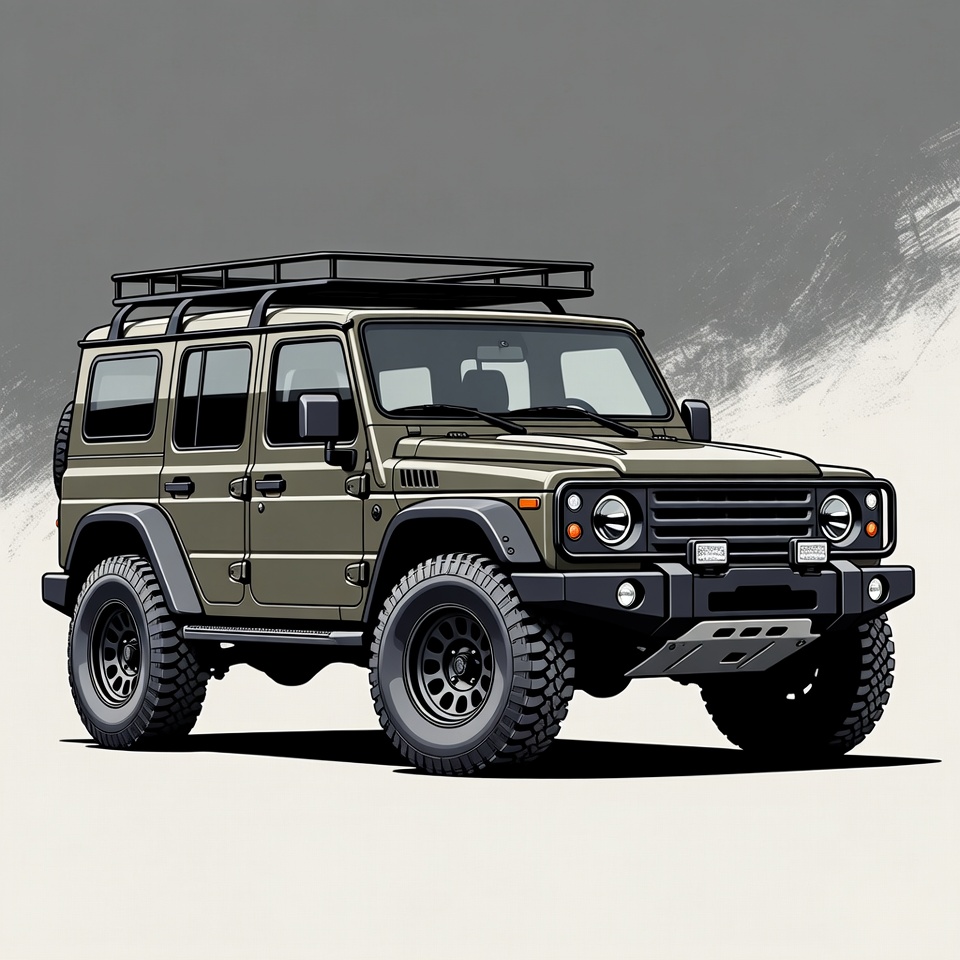 4x4 vehicle, adventure vehicle, automotive design, black wheels, boxy SUV, bumper guard, digital art, four-door SUV, green SUV, headlights, illustration, isolated background, jeep, large tires, off-roading, roof rack, rugged car, side mirrors, wheel arches, off-road SUV