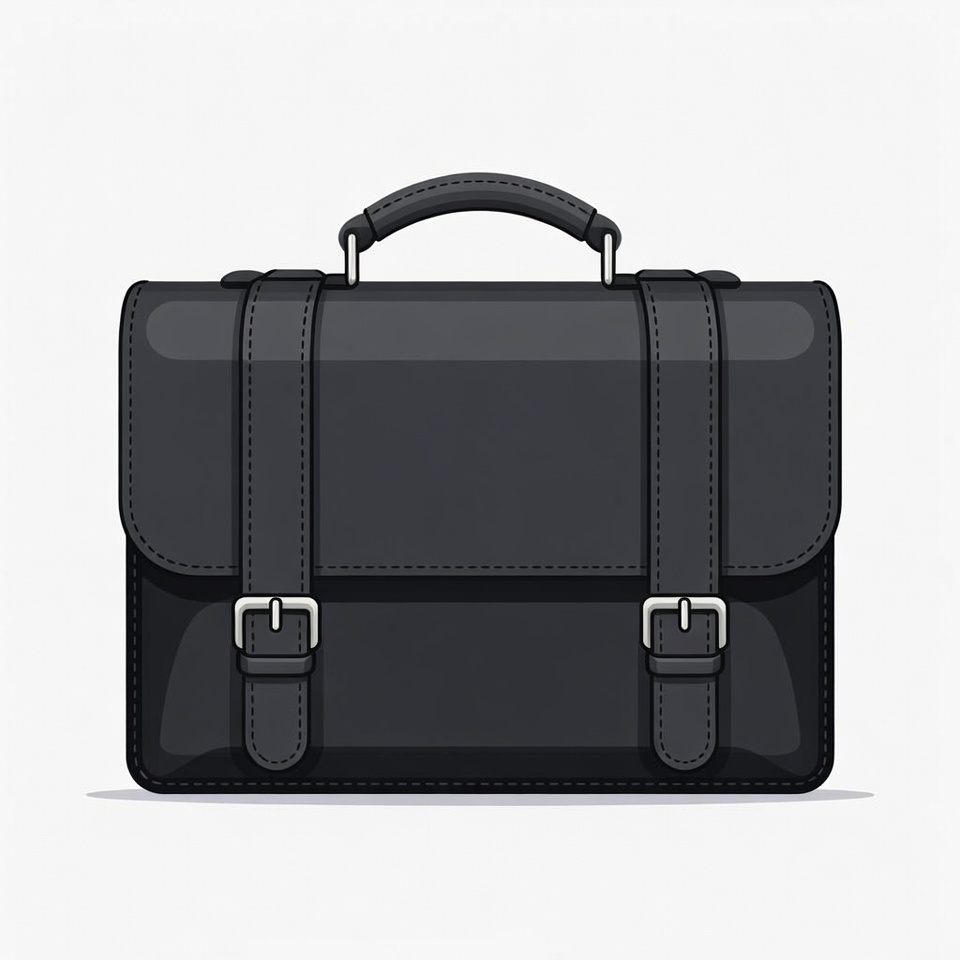 black briefcase, buckles, business bag, clipart, handle, illustration, isolated background, leather briefcase, luggage, office accessory, portfolio bag, silver hardware, vector art, briefcase