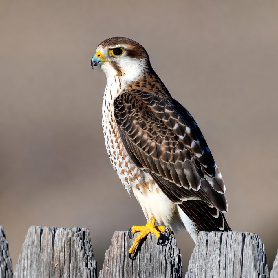 bird, bird of prey, brown feathers, feathers, isolated background, perched, raptor, sharp eyes, white feathers, wildlife, wooden fence, yellow beak, yellow talons, falcon