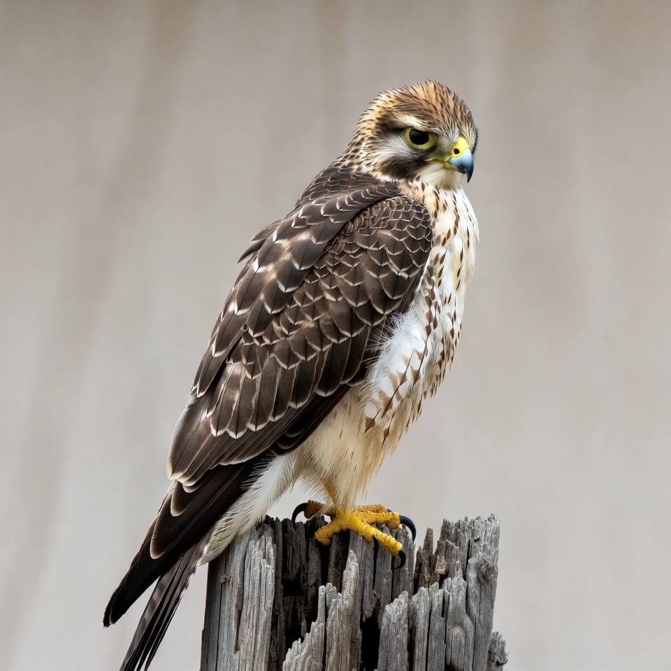 A red-tailed hawk with brown and white feathers perches on a weathered wooden stump. It has a distinctive yellow beak, yellow legs, and piercing yellow eyes. The bird faces slightly to the side against a blurred neutral background.