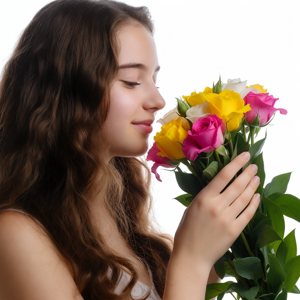 bouquet, brown hair, colorful flowers, female, isolated background, pink roses, roses, smelling flowers, wavy hair, white background, white roses, yellow roses, young woman, woman