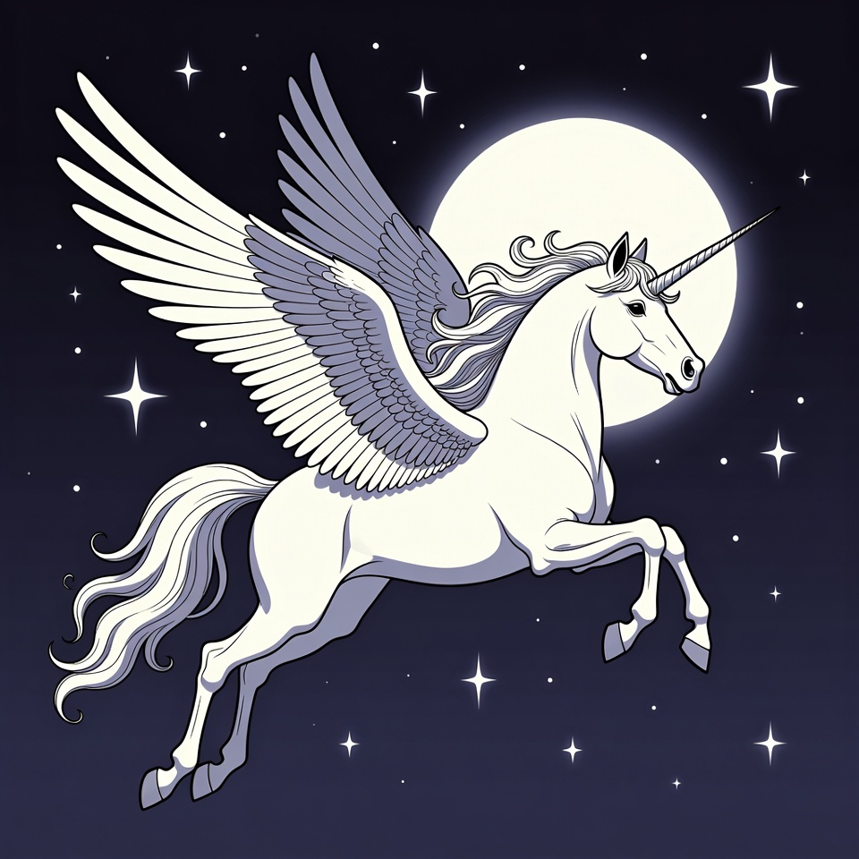 Winged Unicorn Flying in Night Sky