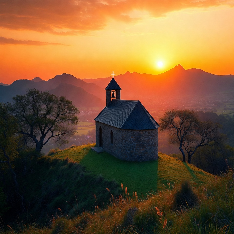 A small stone chapel with a bell tower and cross sits on a grassy hill surrounded by mountains at sunset. The sky glows in vibrant orange and yellow hues with the sun setting behind distant peaks. Twisted trees frame the scene, and rolling valleys extend below.