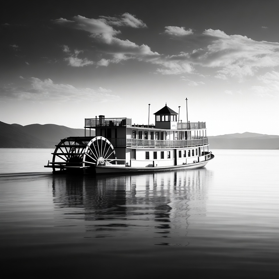 black and white, boat, calm water, clouds, isolated background, lake, monochrome, mountains, nautical, paddle wheel, reflection, riverboat, ship, sidewheeler, sky, steamboat, steamship, vintage boat, water, paddle steamer