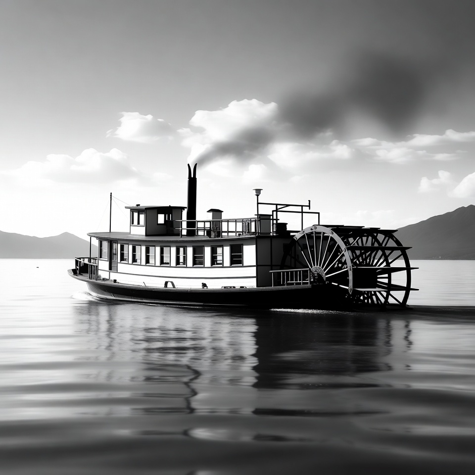 A black and white image shows a classic paddlewheel steamboat sailing on a calm lake with mountains in the background. The boat features large side paddle wheels, a smokestack emitting steam, and a wooden hull with multiple decks. Its reflection is visible in the still water under a cloudy sky.