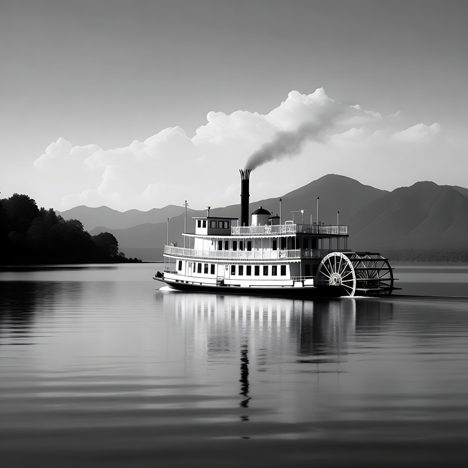 black and white, boat, calm water, chimney, clouds, lake, mountains, nautical, paddle wheel, paddlewheel boat, reflection, riverboat, serene landscape, ship, smoke, steamship, trees, vintage boat, water, steamboat