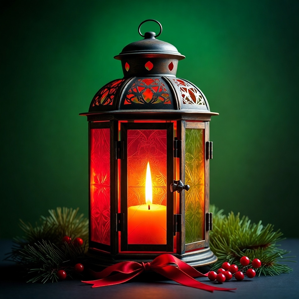 A decorative metal lantern with intricate cutouts glows with a warm red candle flame inside. It stands on a dark surface surrounded by green pine branches, red berries, and a red ribbon. The lantern is set against a deep green background.