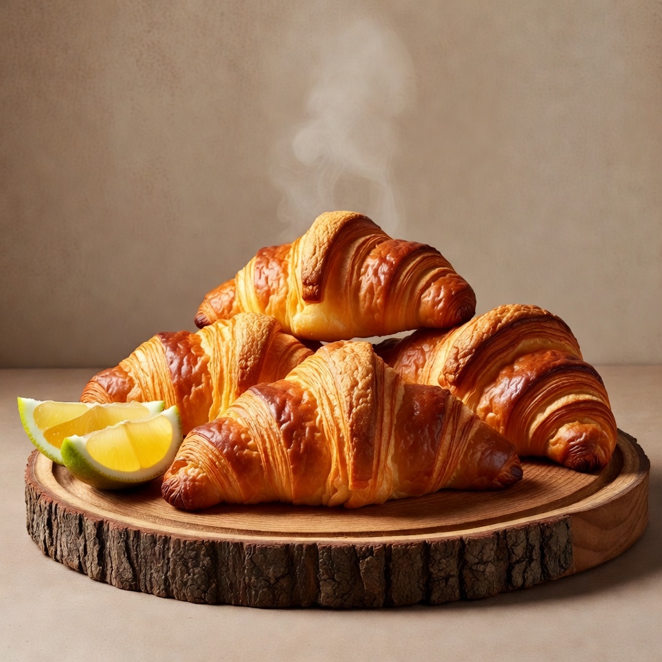 A stack of golden croissants emits steam on a wooden board. Fresh lime slices with green skin and yellow flesh are placed beside them. The setup is on a neutral beige background.