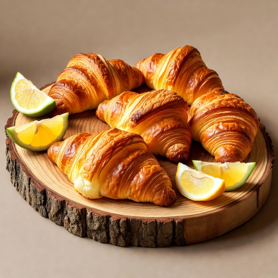 baked goods, bakery items, breakfast pastry, buttery croissants, citrus fruit, cutting board, delicious pastries, flaky pastry, food photography, food styling, fresh baked, fresh croissants, golden croissants, gourmet food, lemon slices, lime wedges, overhead view, pastry, tropical fruit, wood board, croissants