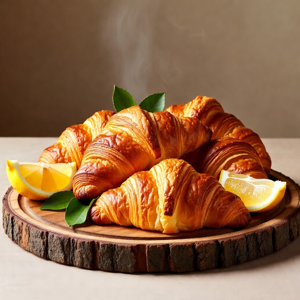 A stack of golden brown croissants is arranged on a wooden board. Fresh lemon slices and green leaves garnish the pastries, with steam rising from the warm baked goods. The setup is placed on a neutral table against a beige background.