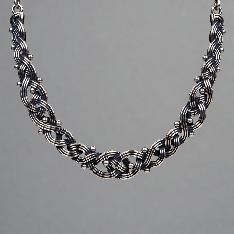 A intricately braided silver necklace with twisted links and small spherical beads along the chain. The necklace forms a curved shape against a plain gray background. The design features interwoven metal strands creating a textured, rope-like appearance.