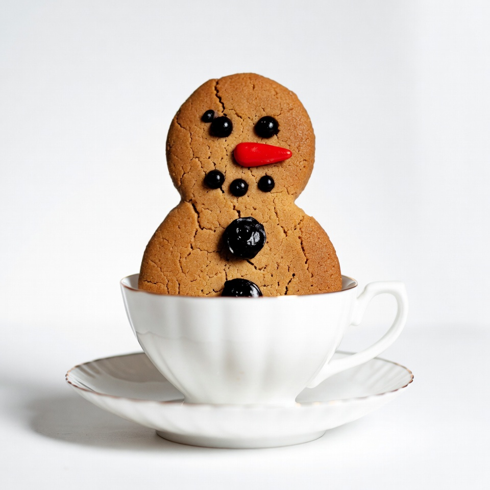 Christmas cookie, baked goods, cookie in cup, festive cookie, food photography, gingerbread cookie, holiday treat, isolated background, raisin buttons, red nose, saucer, snowman cookie, teacup, white background, white teacup, gingerbread man