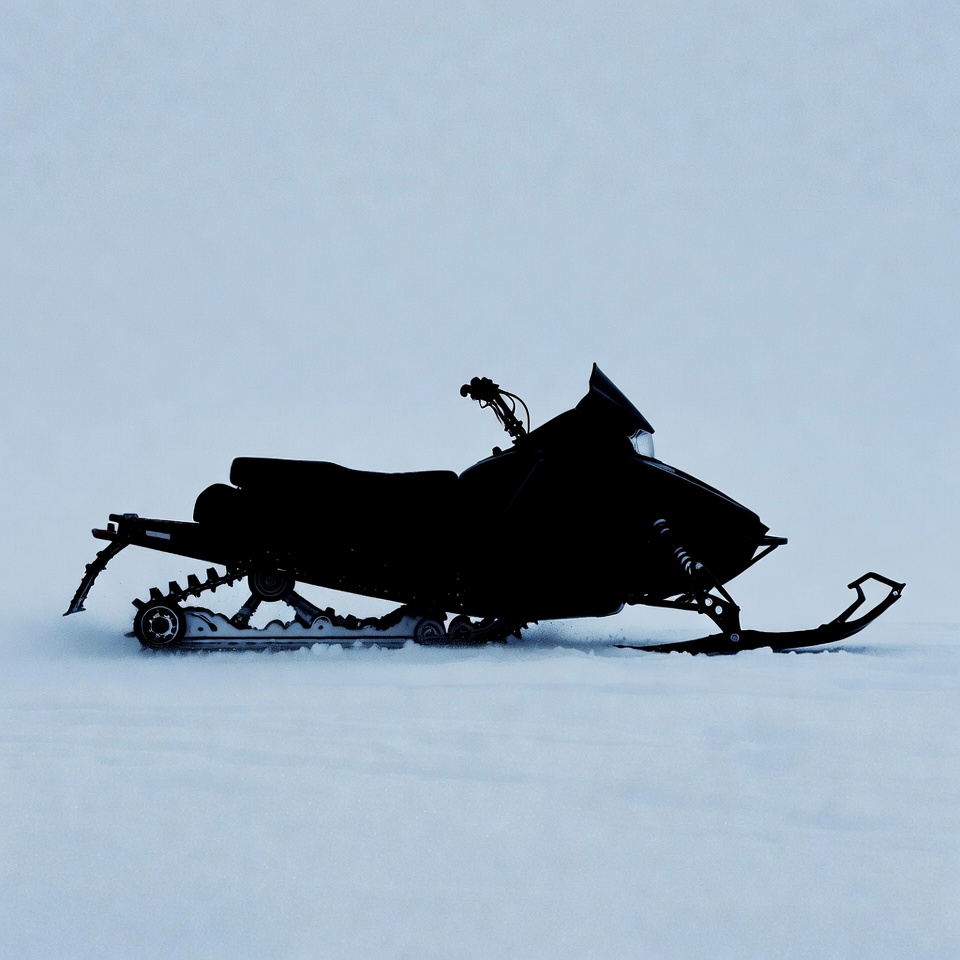 black snowmobile, frozen landscape, outdoor, powersport, recreation, side view, silhouette, skis, snow, snowy field, tracks, vehicle, white background, winter, snowmobile