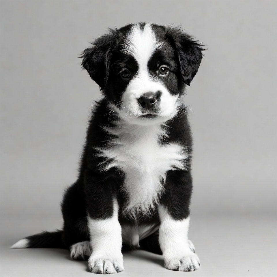 A cute Border Collie puppy sits on a plain gray background in black and white. The puppy has fluffy black fur with white markings on its face, chest, paws, and tail tip. It gazes forward with bright eyes and a slightly open mouth.